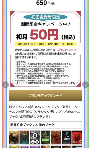 前から気になっていたTRPG「クトゥルフの呼び声」アプリ。ルールブックやシナリオなんかが読み放題のサブスクサービスなんですが、この度通常月650円のベーシックブランが1ヶ月限定で50円というキャンペーンが始まったので登録してみました。 プレイする予定…