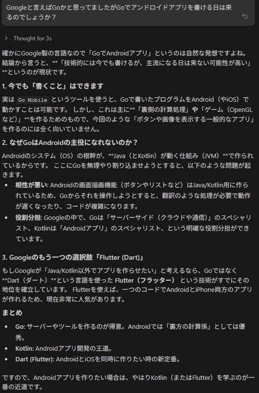 Studioの全体映像はこういう感じ。これは・・アンドロイドアプリが作りたい場合はAntigravityを使う必要は全く無いな。もしもこれで一発で動くアンドロイドアプリなんかが出来たりしてしまった日には・・グーグルプレイ(アプリストア)にAIで作られた大量のアプリが溢れかえることになりそう・・・ま、でもそうそう一発で動くなんて事は・・