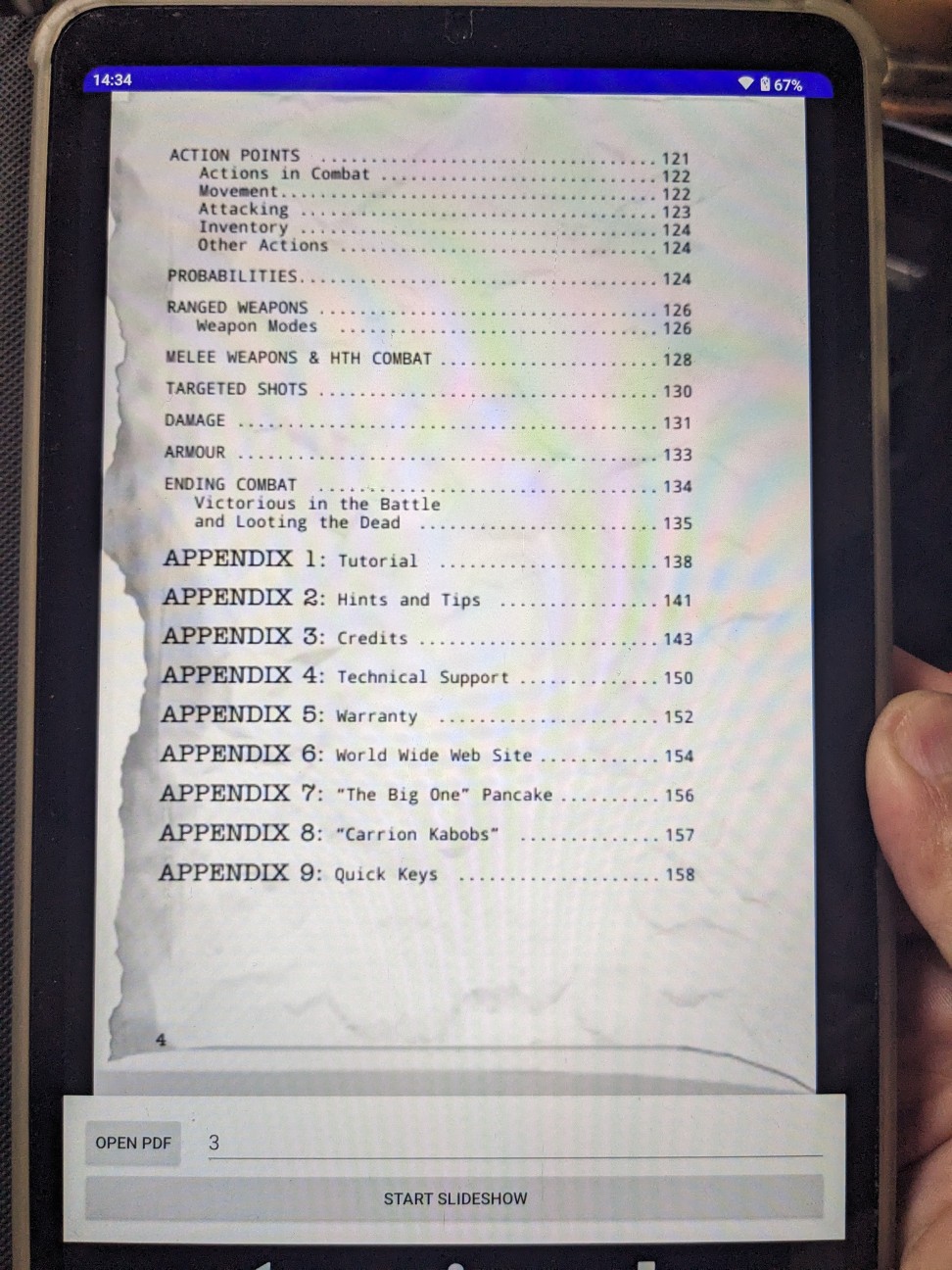 動いたーっ!UIは説明不要のシンプルさ。数字の部分はインターバルの秒数でOpenPDFボタンで端末内のPDFファイルを選択、Start SlideShowボタンでスライドショー開始・・・